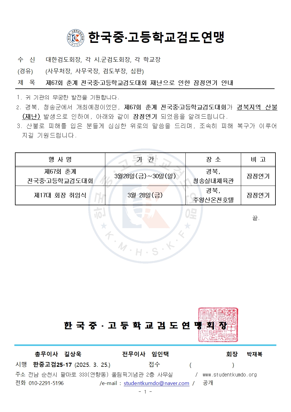 [긴급] 제67회 춘계 전국중고등학교검도대회 잠정 연기 알림
